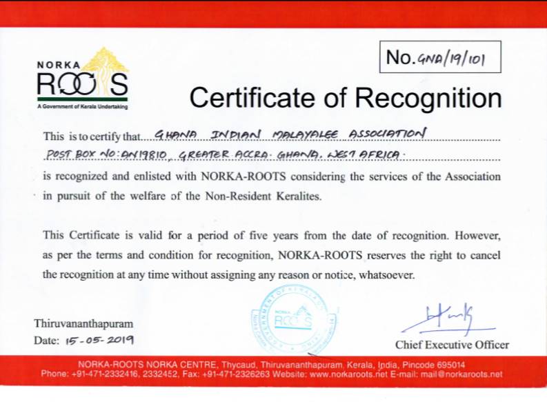 GIMA is now recognized and enlisted under NORKA- ROOTS, for next 5 years. GIMA is the first AFRICAN Association ever getting this recognition from NORKROOTS. We hope, with this prestigious recognition GIMA will get more opportunity to help non resident keralites residing in Ghana. We also hope that, this recognition will encourage our team to take more initiatives such as Madhuram Malayalam Language Class, Onam Celebration and Gima's flagship Event RASGULLA.